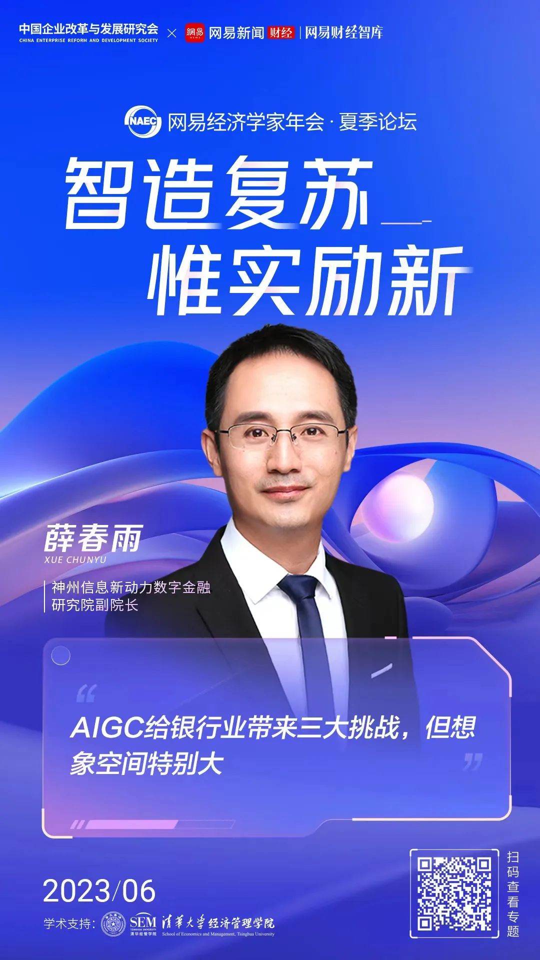 由中国企业改革与发展研究会、网易财经、网易财经智库联合主办的2023网易经济学家年会夏季论坛于6月19日在上海举行,本届论坛的主题是《智造复苏 惟实励新》,清华大学经济管理学院提供学术支持。BB贝博艾弗森官网新动力数字金融研究院副院长薛春雨参与了以“被ChatGPT带飞的AIGC”为主题的圆桌讨论,给出了他的真知灼见。