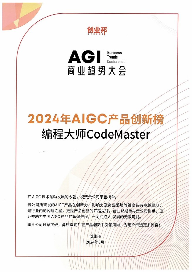 “编程大师 CodeMaster”获选“2024年AIGC产品创新100强”
